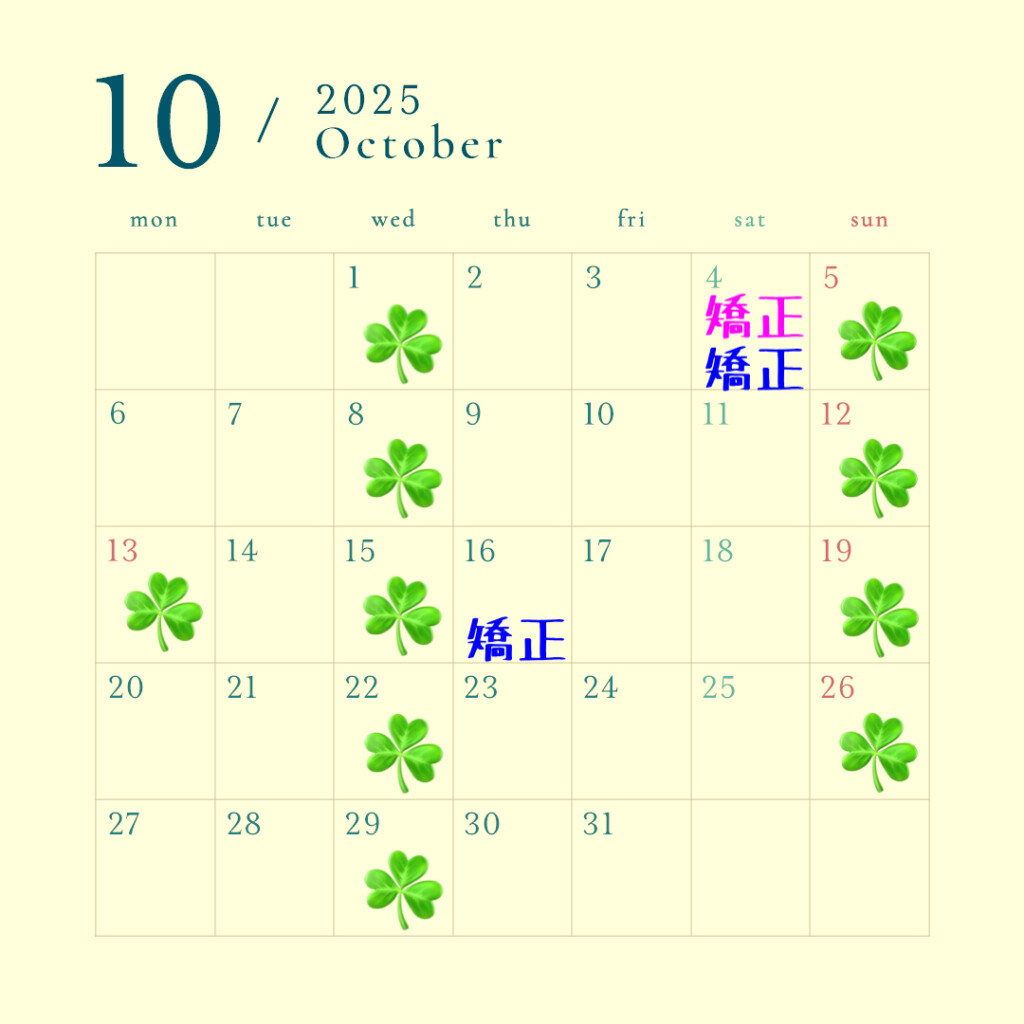 『10月の診療日について』 むつみ橋通り歯科クリニックです。10月の診療日は以上のようになっています。☘️マークの日は休診日です。矯正のピンク文字は午前・青文字は午後の診療です。どうぞ宜しくお願いいたします。 むつみ橋通り歯科クリニック