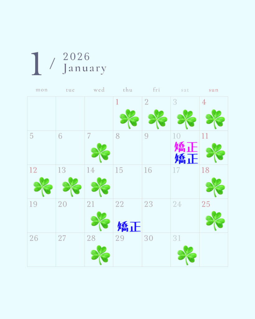 矯正のピンク文字は午前・青文字は午後の診療です。